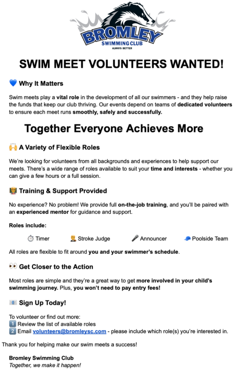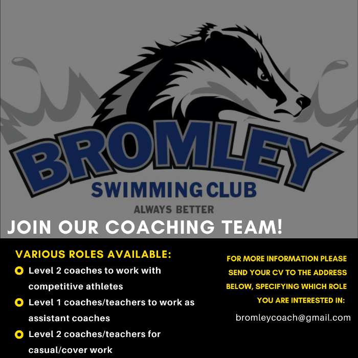 Bromley Swimming Club was established in 1898 and has changed shape many times in its 125 years, but since 2009 has become one of the most successful small clubs in the country. We aim to cater for all levels of competitive swimming, from beginners right up to Masters (adult competitors).